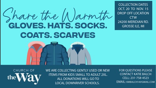 From October 20 through November 15, CTW will be collecting gloves, hats, socks, coats, and scarves for kids throughout the Downriver community. We are asking that you help us share the warmth by purchasing new items or donating very gently used items. These items will be given to local Downriver Schools, who will, in turn, provide them directly to the kids in need. Starting October 20, there will be a collection box on the front porch for you to drop off any donations you may have.